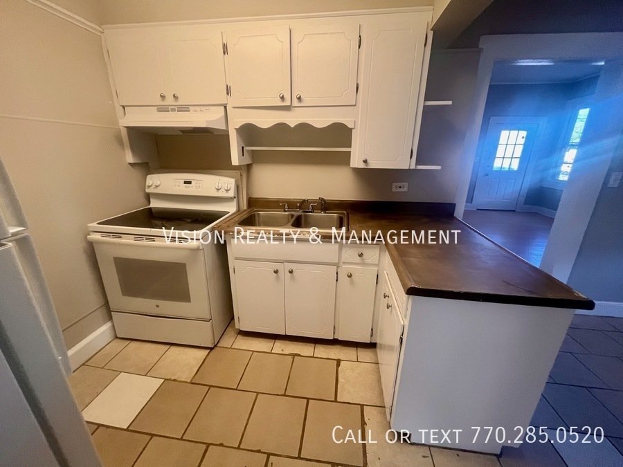 The kitchen provides ample cabinet and counter space, making meal preparation convenient and efficient.